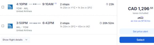 3. Search for a flight from Ottawa (YOW) to Auckland, New Zealand (AKL)